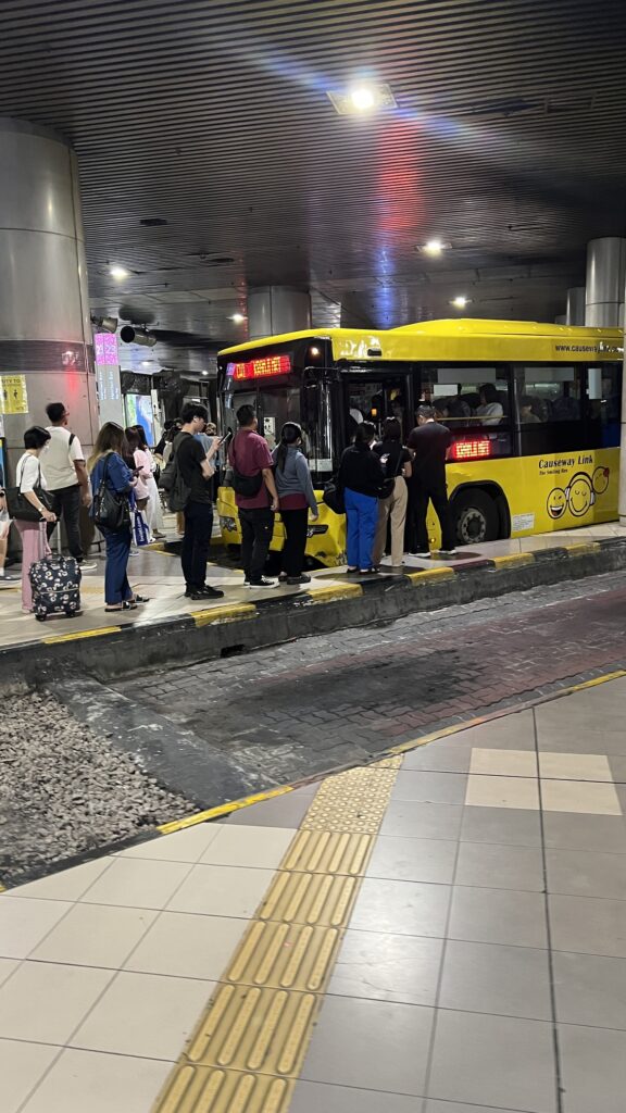 4. Clear immigration, walk back out to the bus area and board any Causeway Link bus heading to your destination (it doesn’t have to be the exact same one you arrived on). There are multiple buses running to the same final stops, so just get on whichever one is ready. You’ll tap your card again at the door, but don’t panic – it won’t charge you twice. It’s just confirming you’re continuing the same journey.